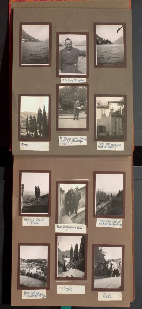 Eines der beiden Fotoalben ist einer Italienreise gewidmet. Ein sehr typisches Genre (groß)bürgerlicher Familien, ob jüdisch oder nicht-jüdisch. Wie im Folgenden auch im Album der Familie von der Porten zu sehen sein wird, sind auch hier im Fall der Familie Neustadt immer wiederkehrende Motive zu entdecken. Zum einen enthalten die Alben – offenbar in der Nachahmung von Motiven aus zeitgenössischen Zeitschriften – sehr viele Landschaftsaufnahmen. Sehr gängig ist das Setting „Mann vor Auto vor Landschaft“. Zum anderen dokumentieren diese Alben den Besuch typisch deutscher bildungsbürgerlicher Reiseziele der Zeit: es werden zu Bildungszwecken mittelalterliche deutsche Städte wie Nürnberg, Rottenburg ob der Tauber oder Heidelberg besucht, genauso wie italienische oder griechische Städte, oft vorausgewählt durch genauestes Studium des Baedeker. Beliebt sind ebenso die Alpen als Studienobjekt der Schönheit der Landschaft. Auch im Album der Neustadts lassen sich diese Motive finden: auf der Albumseite links ist eines der Fotos mit „Florenz“ beschriftet und besonders interessant ist die Bildunterschrift daneben „In Florenz unter Palmen wird der Baedeker studiert“.