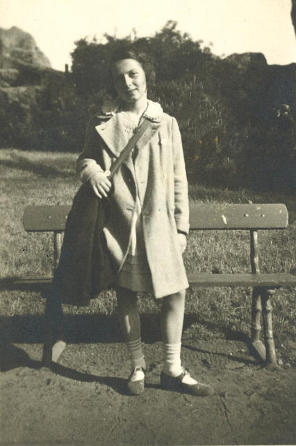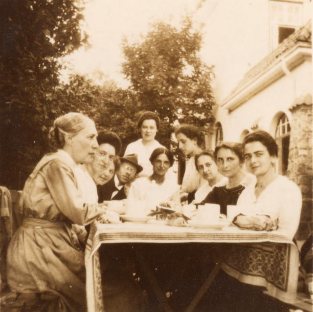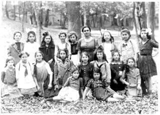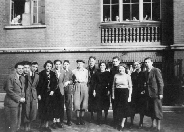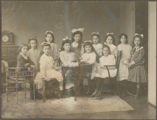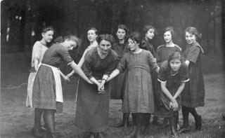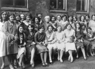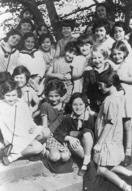 Das vermutlich um 1933 entstandene Foto zeigt Ruth Moses (mittlere Reihe, zweite von links) und weitere Schülerinnen der Klasse Lilli Traumanns. Einige der Mädchen, wie beispielsweise Edith Hirt (erste Reihe, erste von links), Marion Heymann (erste Reihe, zweite von rechts) sowie Hilde Falck (hinterste Reihe, zweite von links), verfassten in der 1. Klasse Zweizeiler für ein Aufsatzheft für Traumann.