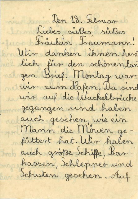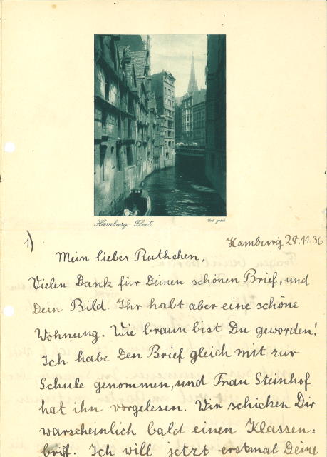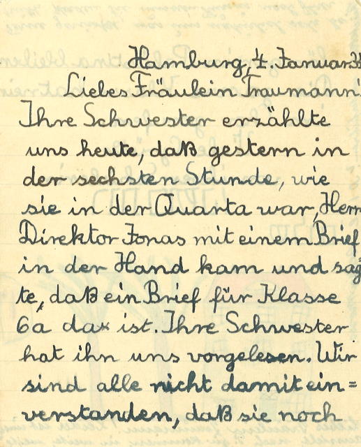 Ab 1933 nahmen jüdische Menschen in Deutschland zunehmend Abschied von Verwandten, Freunden und Bekannten. Briefe bildeten die einzige Möglichkeit, um weiterhin in Kontakt zu bleiben. Der Gedenk- und Bildungsstätte Israelitische Töchterschule liegt ein Konvolut an Briefen vor, welches die Nachrichten ehemaliger Schülerinnen an ihre 1933 nach Palästina ausgewanderte Lehrerin, Lilli Traumann, umfasst. Die liebevoll geschriebenen und gestalteten Briefe der Kinder stellen insbesondere den Trennungsschmerz von ihrer Lehrerin sowie die Hoffnung auf ein Wiedersehen in Palästina in den Mittelpunkt. Leider sind zu vielen der Mädchen bislang keine weiteren biografischen Hintergründe bekannt.