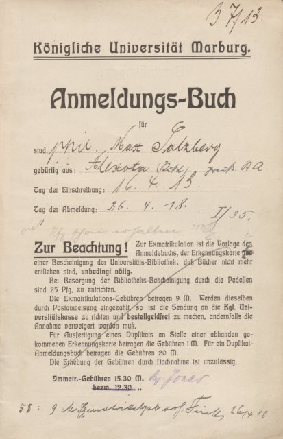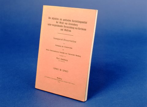 Nach erneuter Immatrikulation an der Marburger Universität wurde Max Salzberg am 27.6.1917 über „Die Adjektiva als poetisches Darstellungsmittel bei Wirnt von Gravenberg unter vergleichender Heranziehung von Hartmann und Wolfram“ promoviert.
