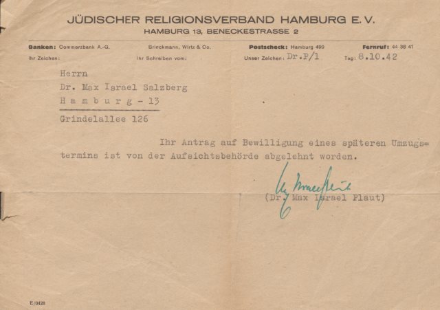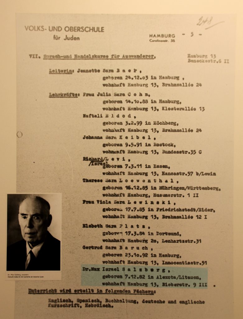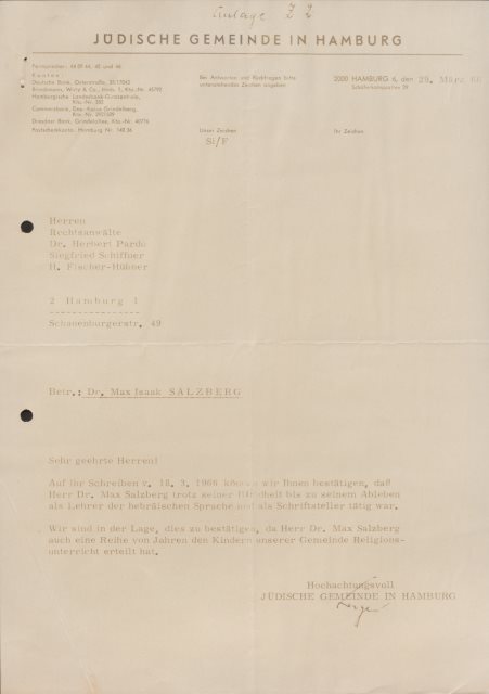 „In weitesten Kreisen der Hamburger Gemeinde ist er [Max Salzberg] als bedeutender Kenner des hebräischen Schrifttums von der biblischen und talmudischen Zeit bis zur Gegenwart bekannt und hochgeschätzt. Jugendliche und ältere Männer und Frauen suchen ihn auf und sind von seinem Unterricht begeistert. […] Ich selbst komme seit längerer Zeit zu Herrn Dr. Salzberg zum Zweck der Fortbildung im Neuhebräischen und bewundere jedesmal [sic] seine umfangreichen Kenntnisse.“ (Brief von Rabbiner Dr. Joseph Norden vom 14.08.1939, Staatsarchiv Hamburg, 622-1/214 Salzberg, Nr. 38.)