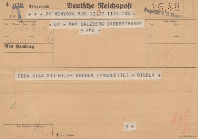 Wie Korrespondenzen und Telegramme belegen, griffen Gisela Warburg und ein Bruder von Max Salzberg zudem auf persönliche Kontakte zurück, um den Salzbergs die Emigration zu ermöglichen. Als sich die Überfahrt in die USA als schwierig gestaltete, versuchten beide, für das Ehepaar ein Visum in Kuba zu erhalten. Die Bemühungen blieben dennoch erfolglos: Kurz bevor die Salzbergs Deutschland verlassen konnten, wurde am 23.10.1941 das Auswanderungsverbot für Jüdinnen und Juden erlassen. Max Salzbergs schlechter gesundheitlicher Zustand infolge des Unfalls verhinderte zudem weitere Fluchtpläne.
