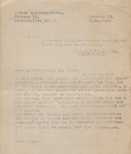 Frida Salzberg versuchte erneut, sich dieser Anordnung zu widersetzen und bat darum, dass ihr Mann von seinen drei Schreibmaschinen zumindest die Smith Premier Nr. 4, die für seine Anfordernisse umgerüstet worden war, behalten durfte: „Die Ablieferung ins-besondere [sic] der letzteren bedeut et [sic] für meinen Mann nicht mehr und nicht weniger, als wenn einem Einbeinigen die Prothese genommen wird.“ (Brief von Frieda Salzberg-Heins an den Jüdischen Religionsverband Herrn Dr. Plaut vom 25.6.1942, Staatsarchiv Hamburg, 622-1/214 Salzberg, Nr. 38) Ihr Gesuch hatte Erfolg. Max Salzberg durfte zumindest eine seiner Schreibmaschinen behalten und schrieb während des Krieges seine Erinnerungen an Kindheit und Jugend in Litauen nieder.