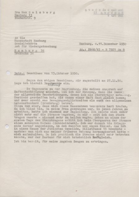 Salzberg widersprach dieser Begründung am 11.12.1950 und verwies auf die besonderen Umstände infolge seiner Erblindung: „Da meine Frau gezwungen war, in jenen Jahren zu arbeiten, hatte ich niemand zur Begleitung. Ich konnte mich daher nicht mehr auf die Strasse [sic] begeben, da mir – seit ich den Stern tragen musste – niemand mehr zu helfen wagte. Schon an einem der ersten Tage des Sterntragens erlitt ich beim Überqueren der Strasse [sic] einen schweren Unfall (Schädelbruch). Ich war danach bis Kriegsende darauf angewiesen, in dem dumpfen und engen Zimmer, das ich in einem Hause der Jüdischen Gemeinde, Dillstrasse [sic] 15 bewohnte […] mich aufzuhalten. Da ich praktisch die Strasse [sic] nicht mehr betreten konnte, war der Zustand für mich tatsächlich Haftgleich.“ (Brief von Max Salzberg an die Hansestadt Hamburg, Sozialbehörde, Amt für Wiedergutmachung vom 11.12.1950, Staatsarchiv Hamburg, 622-1/214 Salzberg, Nr. 42 (3)) Der Widerspruch hatte Erfolg, allerdings wurde Max Salzberg erst rund ein Jahr später, im Oktober 1951, eine Haftentschädigung bewilligt.