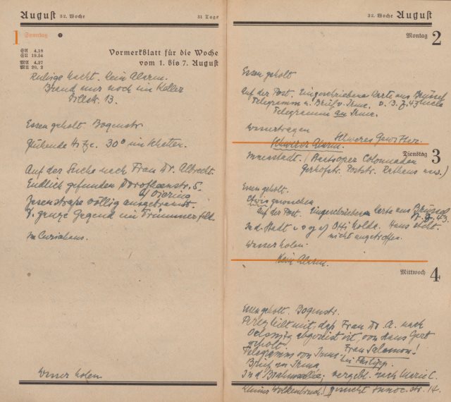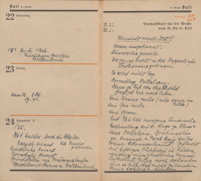Frida Salzberg schrieb nahezu täglich, auch während der Kriegsjahre, Termine und Erlebnisse in ihren Kalender. Diese stellen eine ergiebige Quelle für die Alltagsgeschichte in der NS-Zeit dar. Neben einschneidenden Ereignissen, wie die Zwangsumquartierungen oder Vorladungen vor die Gestapo, notierte Frida darin auch Alltägliches, wie Einkäufe, Unterrichtsstunden und erhaltene Briefe. Sehr eindrucksvoll sind ihre Schilderungen der „Operation Gomorrha“, bei der eine Reihe von britischen und US-amerikanischen Luftangriffen vom 24.7. bis 3.8.1943 große Teile Hamburgs zerstörten. Am 24./25.7. schrieb Frida: „¾ 1 nachts brach die Hölle los: Rappstr. brennt. alle Fenster gebrochen. Rutschbahn brennt. Bornstraße brennt. Grindelallee ein Trümmerhaufen. […] Die ganze Nacht in der Rappstraße Löschwasser getragen. Es wird nicht Tag. Vormittags Vollalarm […] Kein Wasser mehr (sehr wenig im Keller). Kein Gas mehr. Kein Strom. Erst ½ 6 Uhr morgens Feuerwehr.“ (Vormerkbuch 1943 von Frida Salzberg, Staatsarchiv Hamburg, 622-1/214 Salzberg, Nr. 9.2 (2).)