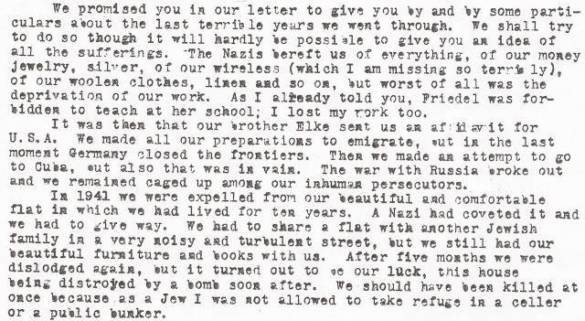 „The Nazis bereft us of everything, of our money, jewelry, silver, of our wireless (which I am missing so terribly), of our woolen clothes, linen and so on, but worst of all was the deprivation of our work. […] We made all our preparations to emigrate, but in the last moment Germany closed the frontiers. Then we made an attempt to go to Cuba, but also that was in vain. The war with Russia broke out and we remained caged up among our inhuman persecutors.”