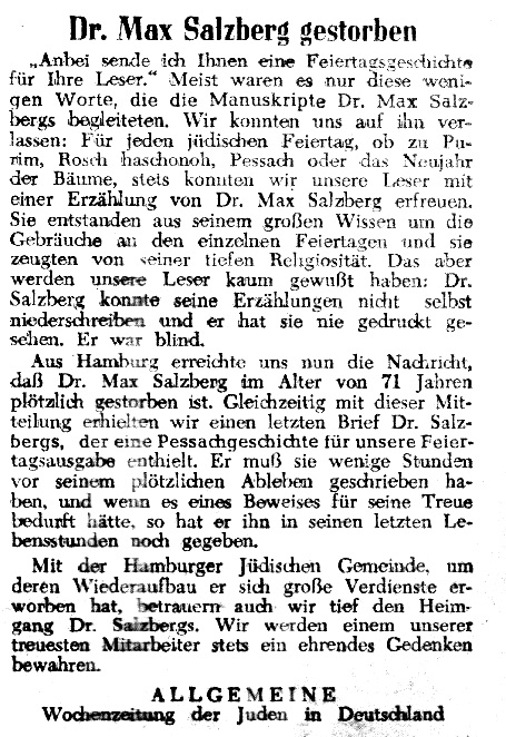 Wenige Tage nach dem Tod von Max Salzberg veröffentlichte die Allgemeine Wochenzeitung der Juden in Deutschland einen Nachruf auf ihn. Darin wird der Stellenwert deutlich, den Salzberg für die Zeitung hatte. Als einer ihrer „treuesten Mitarbeiter“ lieferte er verlässlich für jeden jüdischen Feiertag einen Beitrag. Diese zeugten von seinem großen Wissen sowie tiefer Religiosität, wie es in dem Nachruf heißt. Seine letzte Geschichte für die AWZdJ habe er nur wenige Stunden vor seinem Tod geschrieben. Zudem werden seine großen Verdienste hervorgehoben, die er beim Wiederaufbau der Hamburger jüdischen Gemeinde erworben hatte, vermutlich ein Hinweis auf seine Lehrtätigkeit.