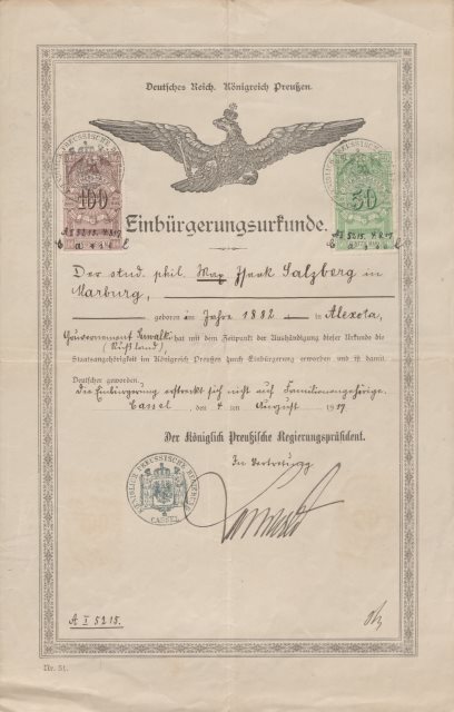 Das gute Verhältnis zu seinen Professoren war für Max Salzberg besonders nach Beginn des Ersten Weltkrieges von Vorteil. Als sogenannter „feindlicher Ausländer“ wurde er 1915 zwangsexmatrikuliert. Nachdem ihm die Verleihung der Staatsangehörigkeit in Hamburg aufgrund seiner jüdischen Religion verwehrt worden war, strebte er 1914/15 die Einbürgerung in Preußen an. Neben Max Warburg, der für Salzberg eine Bürgschaft ausstellte, unterstützten auch die Professoren Ferdinand Wrede (Deutsche Philologie) und Wilhelm Viëtor (Englische Philologie) sein Verfahren mit befürwortenden Schreiben, in denen sie seine Studienleistungen und umfangreichen Kenntnisse hervorhoben.