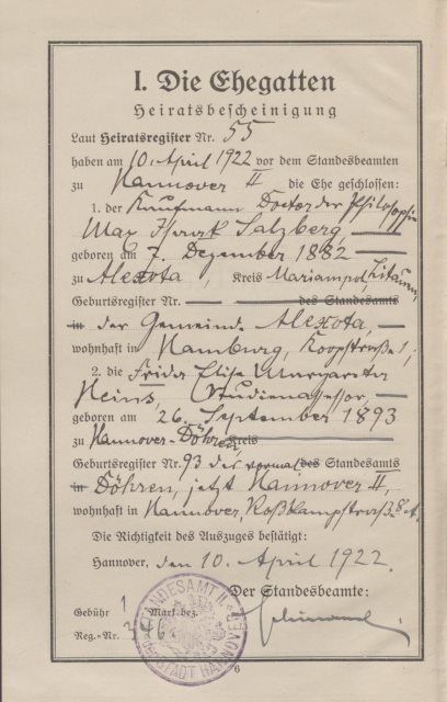 Während seines Studiums in Marburg lernte Max Salzberg seine Kommilitonin Frida Heins kennen. Sie war 1893 in Waldheim bei Hannover als Tochter eines Beamten und einer wohlhabenden Bürgertochter geboren worden. Seit 1914 studierte sie in Freiburg und Marburg Deutsch, Englisch und Philosophie und erhielt 1921 ihr Staatsexamen. Zugleich erwarb sie ihre Lehramtsbefähigung für höhere Mädchenschulen.