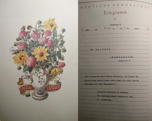 Der Alltag des Ehepaars Salzberg war in der Nachkriegszeit nicht nur durch das langwierige Wiedergutmachungsprozedere geprägt. Der Verlust eines Großteils ihres Freundes- und Bekanntenkreises durch Emigration, Ermordung oder den durch Verfolgungsdruck bedingten Freitod traf besonders Max Salzberg hart. Aufgrund seiner Behinderung waren ihm soziale Kontakte wichtig, da er etwa beim Vorlesen oder Spazierengehen auf Hilfe angewiesen war. Umso wichtiger war für ihn die jüdische Gemeinde in Hamburg, auch aufgrund der Bedeutung, die die jüdische Religion und Kultur in seinem Leben hatten. Mit seiner Tätigkeit als Religions- und Hebräischlehrer, die er in der Nachkriegszeit wiederaufnahm, leistete er einen wichtigen Beitrag zum Wiederaufbau der Gemeinde.
