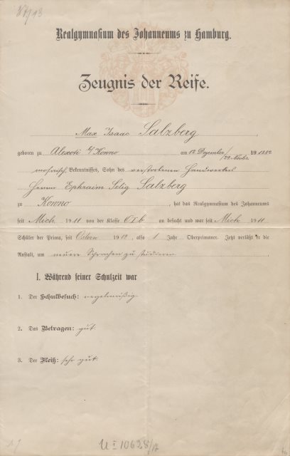 „Ich bin zu Alexota bei Kowno in Russland 1882 als der Sohn eins [sic] Schneidermeisters geboren. Die übergrose [sic] Armut meiner Eltern gestattete ihnen nicht, mich ihrem Idealegemäss [sic] zu einem Talmudgelehrten zu erziehen. Meine Kindesliebe zeigte mir jedoch den Weg, ihren Wunsch trotzdem zu erfüllen. Mit dreizehn Jahren ging ich daher in ein kleines, einige Meilen von meiner Heimat entferntes Städtchen und studierte dort auf einer Talmudschule unter grossen [sic] Entbehrungen; häufig musste ich mir das für meinen Unterhalt notwendigste durch schwere körperliche Arbeit verdienen. […] Die zunehmende Armut meines Vaters infolge Arbeitslosigkeit zwang ihn, mir die Unterbrechung der Talmudstudien für einige Zeit zu gestatten. Ich nahm auf einem Dorf die Stelle eines Talmudslehrer an. Ausser [sic] der langen Arbeitszeit, welche meine zwölf verschiedenaltrigen Schüler erforderten, gab ich noch Privatstunden, die mir später noch eine Reise nach dem ersehnten Auslande gestatten sollten.“(Entwurf eines Briefes von Max Salzberg an Kaiser Wilhelm II zwecks der Bitte um Einbürgerung, undatiert, vermutlich 1914/1915; Staatsarchiv Hamburg, 622-1/214 Salzberg, Nr. 1.)